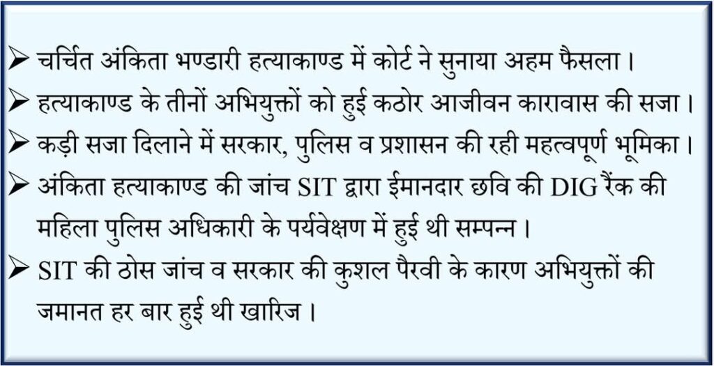 चर्चित अंकिता हत्याकाण्ड में मा0 अपर जिला एवं सत्र न्यायालय कोटद्वार द्वारा अहम फैसला सुनाकर तीनों अभियुक्तों पुलकित आर्या,सौरभ भाष्कर व अंकित गुप्ता को हत्या का दोषी मानते हुए आजीवन कठोर कारावास की सजा सुनाई गई है। इससे कानून के प्रति आमजन का भरोसा और भी मजबूत हुआ है साथ ही अंकिता व अंकिता के परिजनों को भी इंसाफ मिला है।