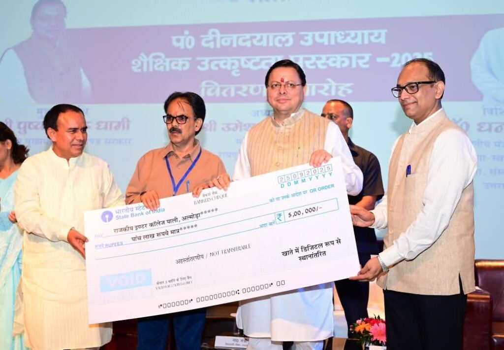 देहरादून: मुख्यमंत्री पुष्कर सिंह धामी ने ननूरखेड़ा स्थित एससीईआरटी ऑडिटोरियम में आयोजित पंडित दीनदयाल उपाध्याय शैक्षिक उत्कृष्टता पुरस्कार समारोह में बोर्ड परीक्षाओं में शीर्ष 10 स्थान प्राप्त करने वाले हाईस्कूल एवं इंटरमीडिएट के 75 मेधावी छात्र-छात्राओं को पुरस्कृत किया। मुख्यमंत्री ने बोर्ड परीक्षाओं में उत्कृष्ट परिणाम देने वाले विद्यालयों के तीन-तीन प्रधानाचार्यों के साथ ही श्रेष्ठ प्रदर्शन करने वाले शीर्ष 50-50 विद्यालयों के प्रधानाचार्यों को भी सम्मानित किया।